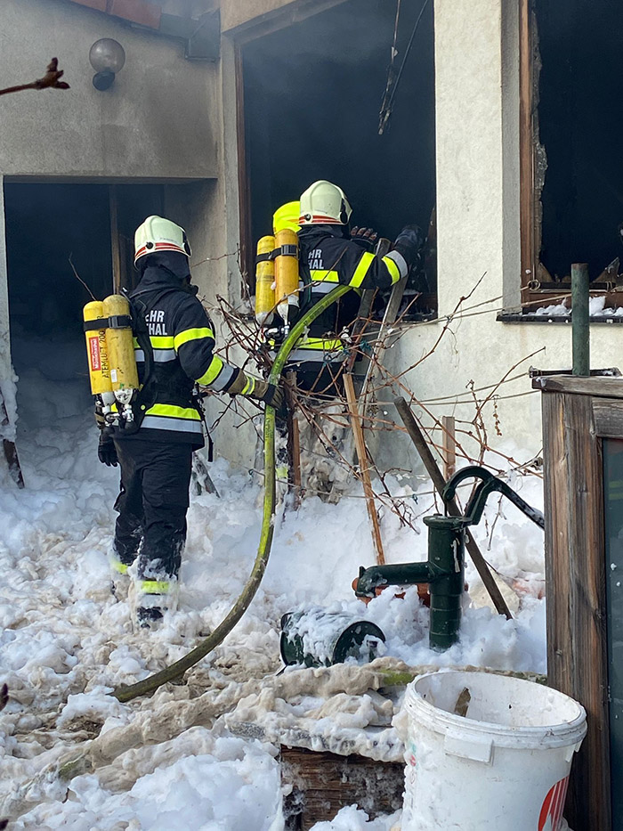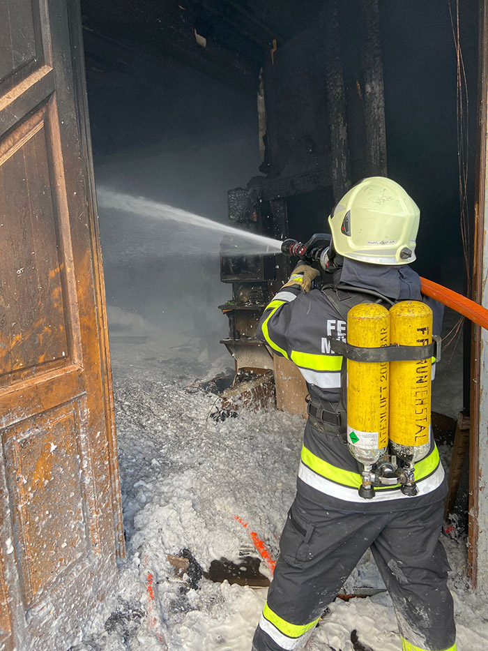 Bei unserem Eintreffen war der Einsatz bereits rund eineinhalb Stunden im Gange, jedoch wurden weitere Atemschutzgeräteträger benötigt. Unser erster Atemschutztrupp rüstete sich bereits bei der Anfahrt aus und konnte sich sofort beim Atemschutzsammelplatz melden. Insgesamt standen 7 Mitglieder der FF Münichsthal mehrmals unter vollem Atemschutz im Einsatz. Neben der Brandbekämpfung unterstützten wir auch beim Entfernen von Brandgut aus dem Gebäude und den Atemschutzsammelplatz mit Tischen und Bänken.